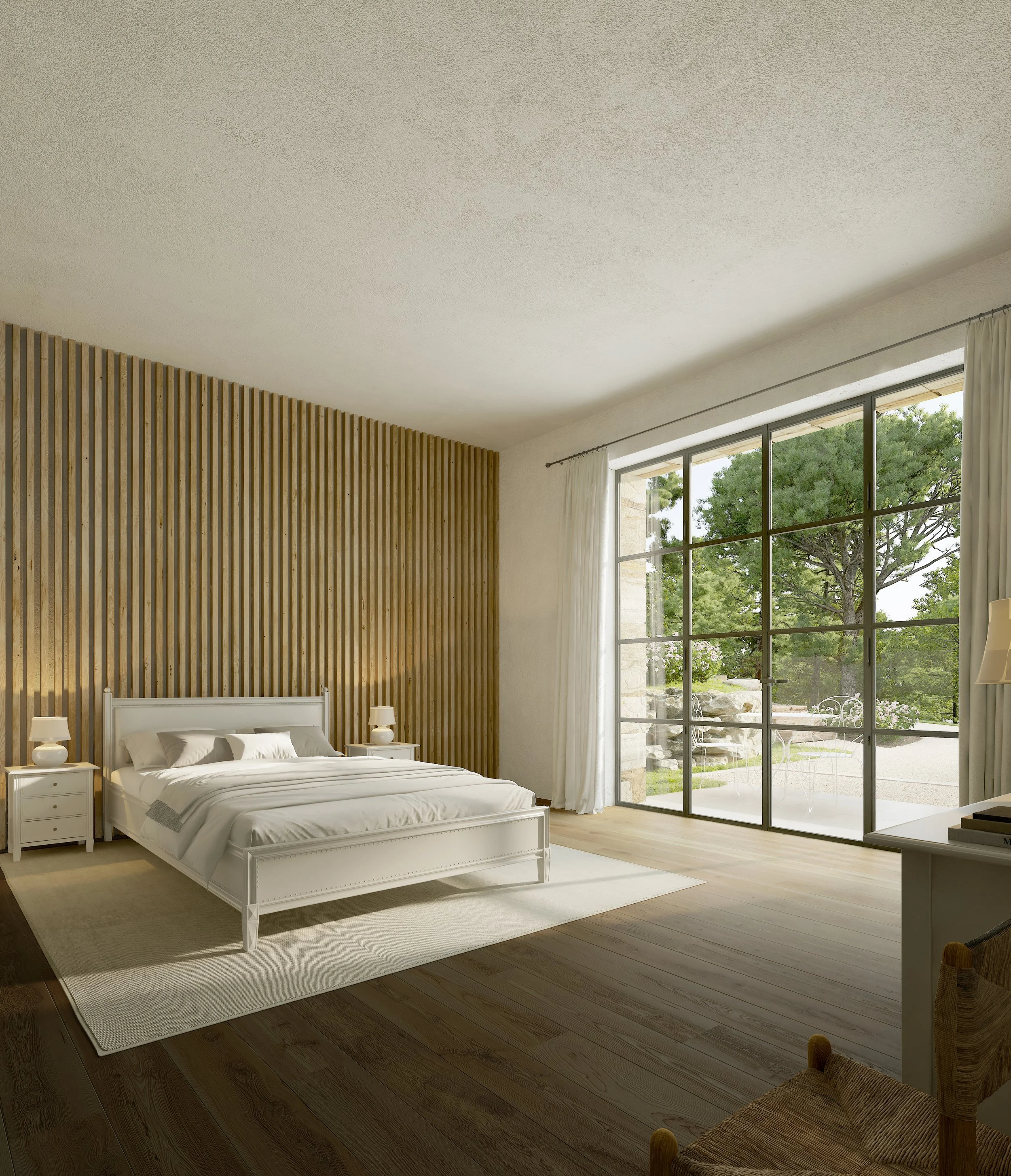Une suite sur jardin offrant calme et intimité. Grandes ouvertures sur la verdure pour une atmosphère sereine et apaisante.